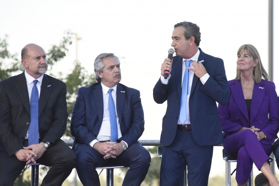 Junto al mandatario y las autoridades provinciales y locales, acompañaron el acto el jefe de Gabinete Santiago Cafiero, el ministro del Interior Eduardo De Pedro, el ministro de Defensa Agustín Rossi, el ministro de Educación Nicolás Trotta, y la vicegobernadora Alejandra Rodenas.