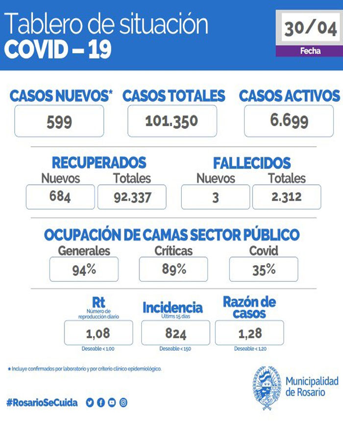 El informe oficial añade que en lo que va de la pandemia por la Covid-19, Santa Fe acumula un total de 274.319 de contagios de los cuales 101.350 corresponden a la ciudad de Rosario.