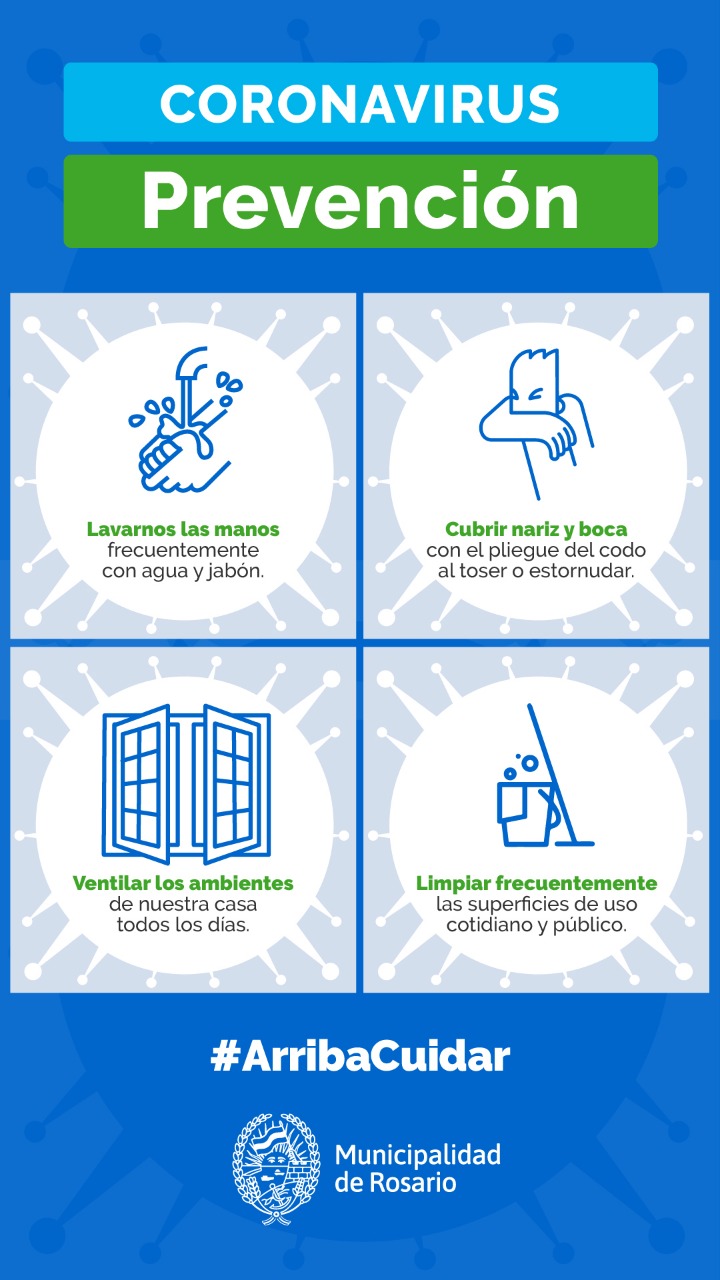Con un gran trabajo en redes, acompañado por la presencia de spots en radio y televisión, #ArribaCuidar propone un protocolo para evitar la propagación de las epidemias que acuden al mundo en particular, y a Rosario en general. Con especial enfasis en el cuidado diario, en la atención a la higiene, y evitar salir del hogar salvo que sea necesario; este slogan que se está promoviendo tiene al rosarino como centro de atención, esperando que esta situación pueda mejorar.